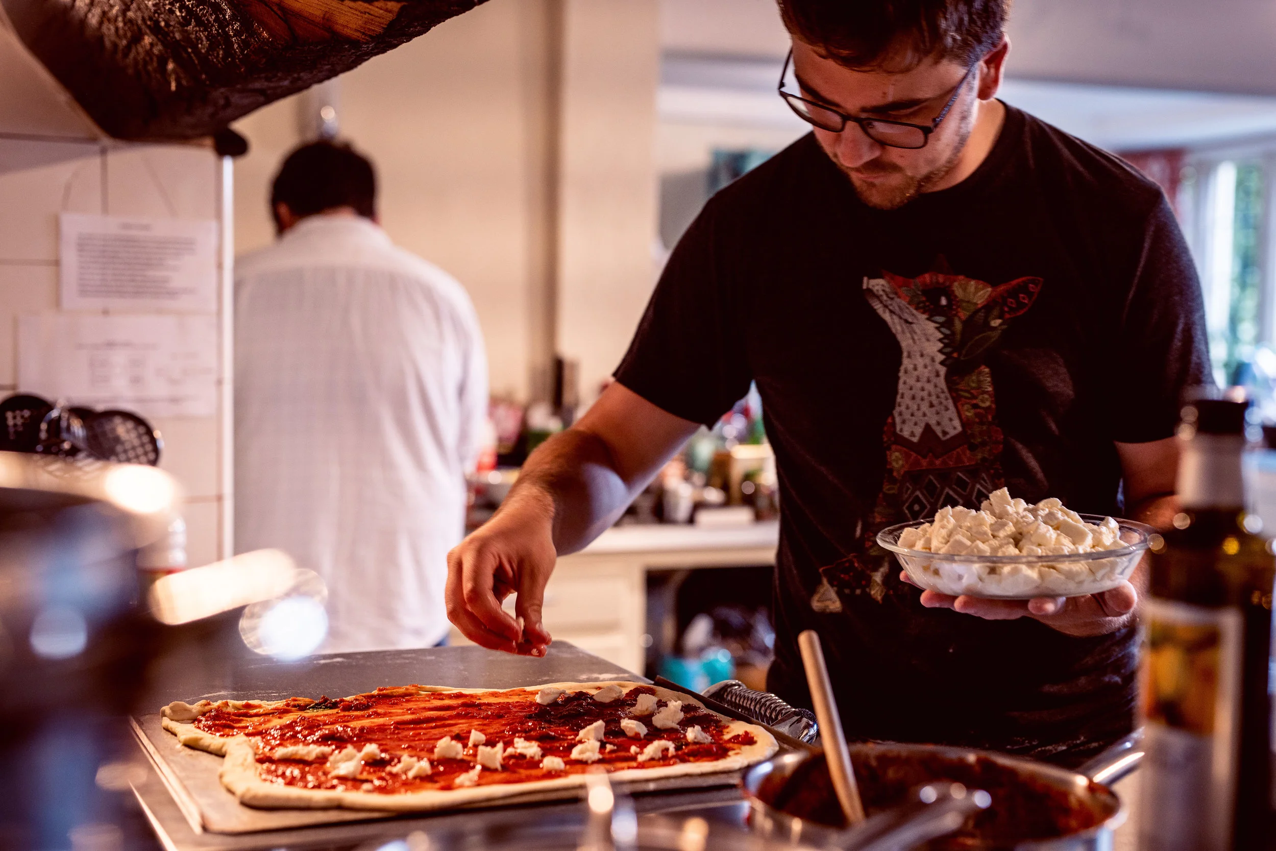One of the little touches they had was a blackboard in the main hallway of the house with everyones names on it so you could tick if you were in for dinner or not. Dinner’s were very community based. People may have been out during the day and often everyone would come back for dinner together. We would all chip in and help out preparing dinner. Different people may take the lead in deciding what to cook for the group if they had a good meal in mind that they wanted to share with everyone. The groom, Rob, makes great pizzas from scratch! Here he is in action!